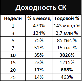 Доходность проекта составляет +50% к накопленной сумме. Срок накопления вы выбираете сами (с учетом доступных свободных мест в Графике выплат), поэтому доходность в годовых процентах является плавающей. Расчет годовой доходности с учетом сложного процента и в зависимости от количества недель накопления приведен в таблице: